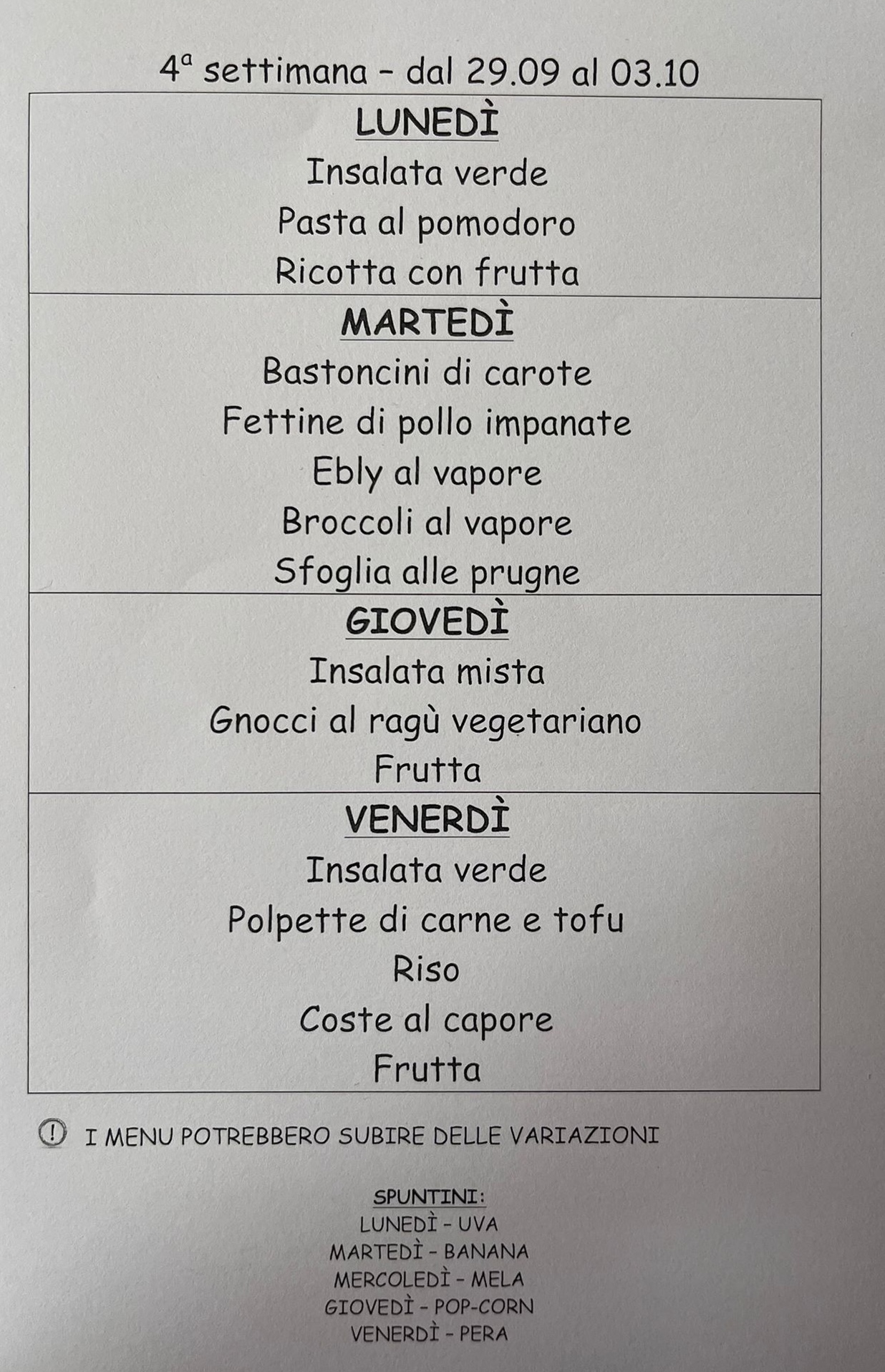 4.9.25 Menu della settimana dal 9.9 al 12.9.25