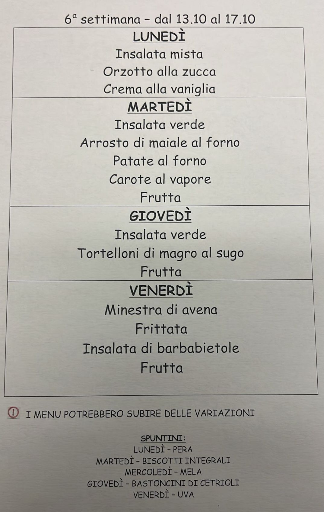 2.10.25 Menu della settimana dal 6 al 10.10.25
