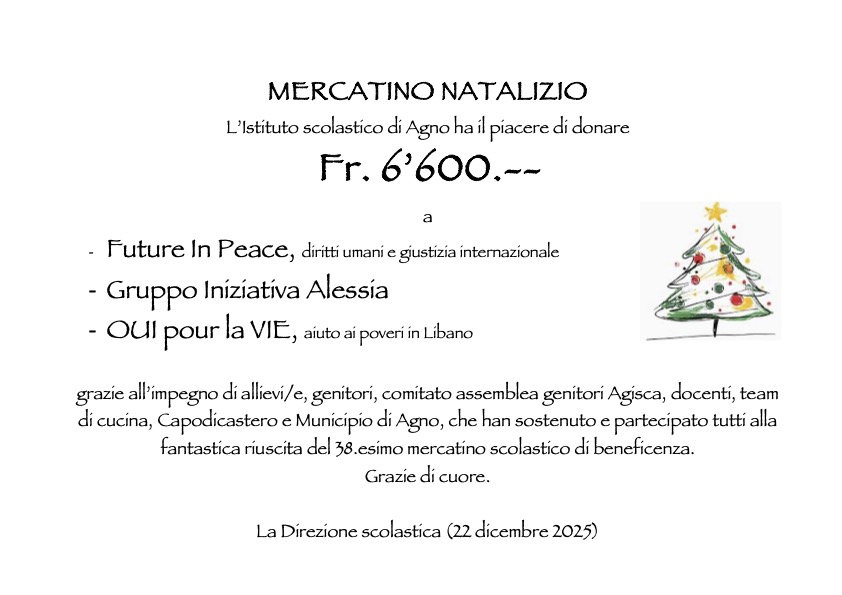 La Direzione scolastica, unita alla Capo Dicastero e all’intero Municipio del Comune di Agno, ringraziano l’assemblea genitori AGISCA per l’organizzazione della notte in palestra per le classi quinte, che ha avuto luogo il 6 giugno 2025, e per aver offerto il gelato ad allieve e allievi di tutto l’Istituto lo scorso 12 giugno. Non da ultimo desiderano esprimere la loro gratitudine per la collaborazione e per le attività proposte durante l’anno scolastico, riferendosi in particolare all’onerosa organizzazione dei doposcuola, molto apprezzati da bambini e genitori.