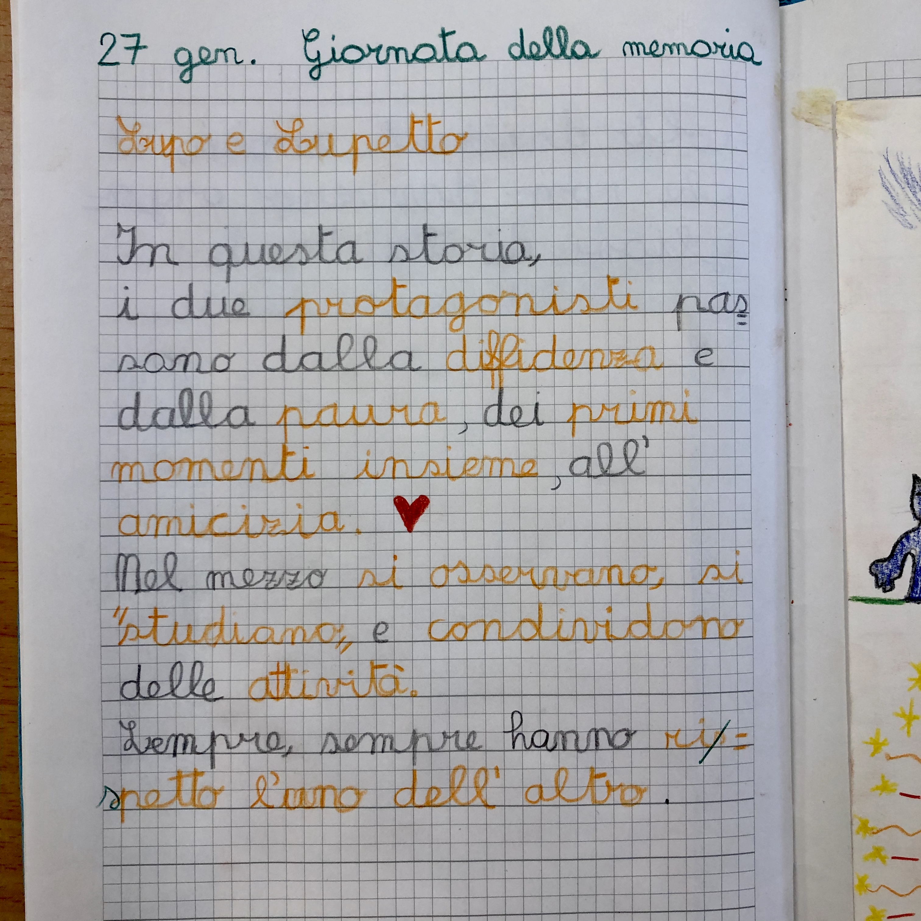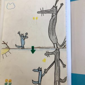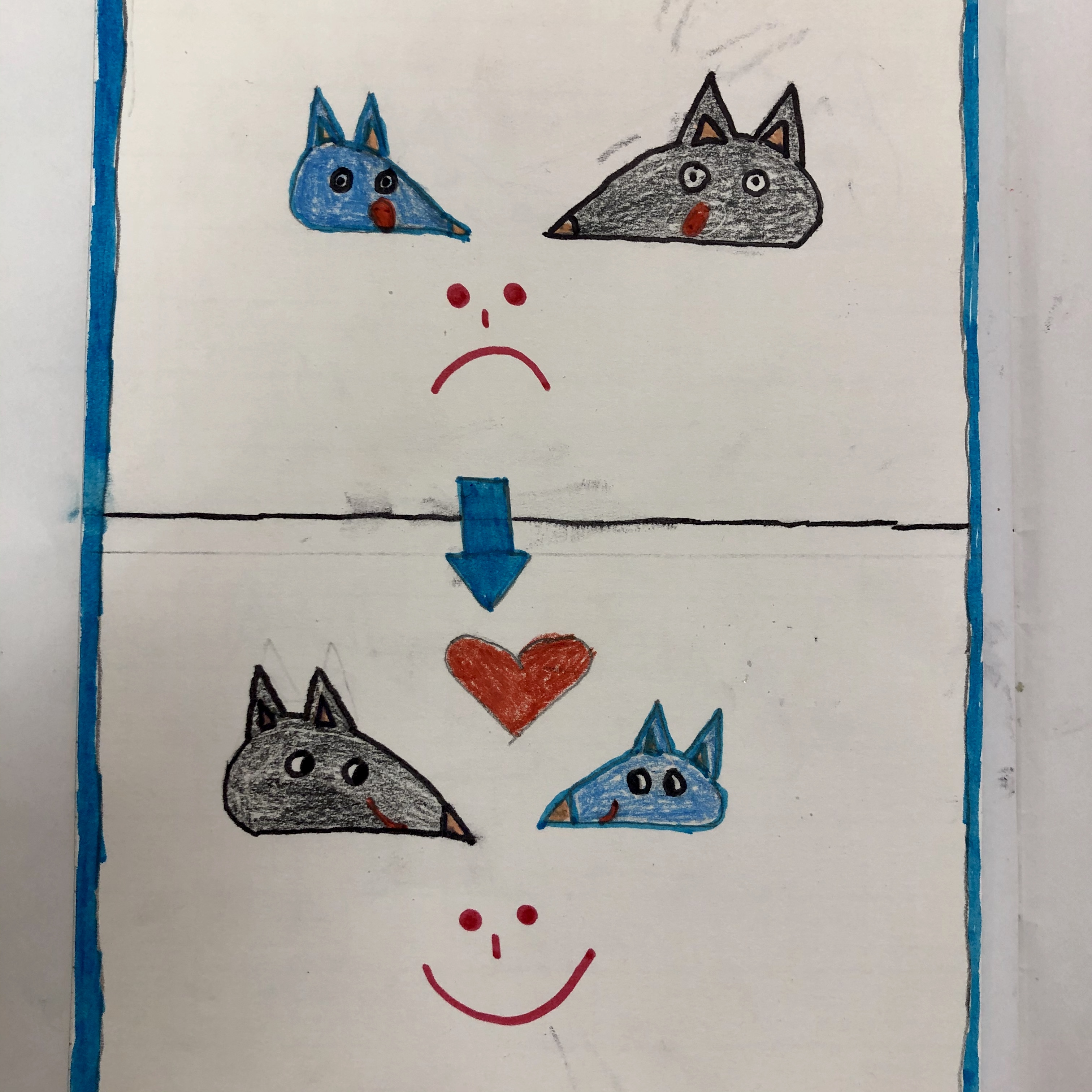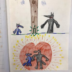 Lupo e Lupetto, dopo un momento di “studio” vicendevole, imparano a volersi bene e a rispettarsi per quello che sono, con tutte le differenze e le qualità di cui sono portatori.